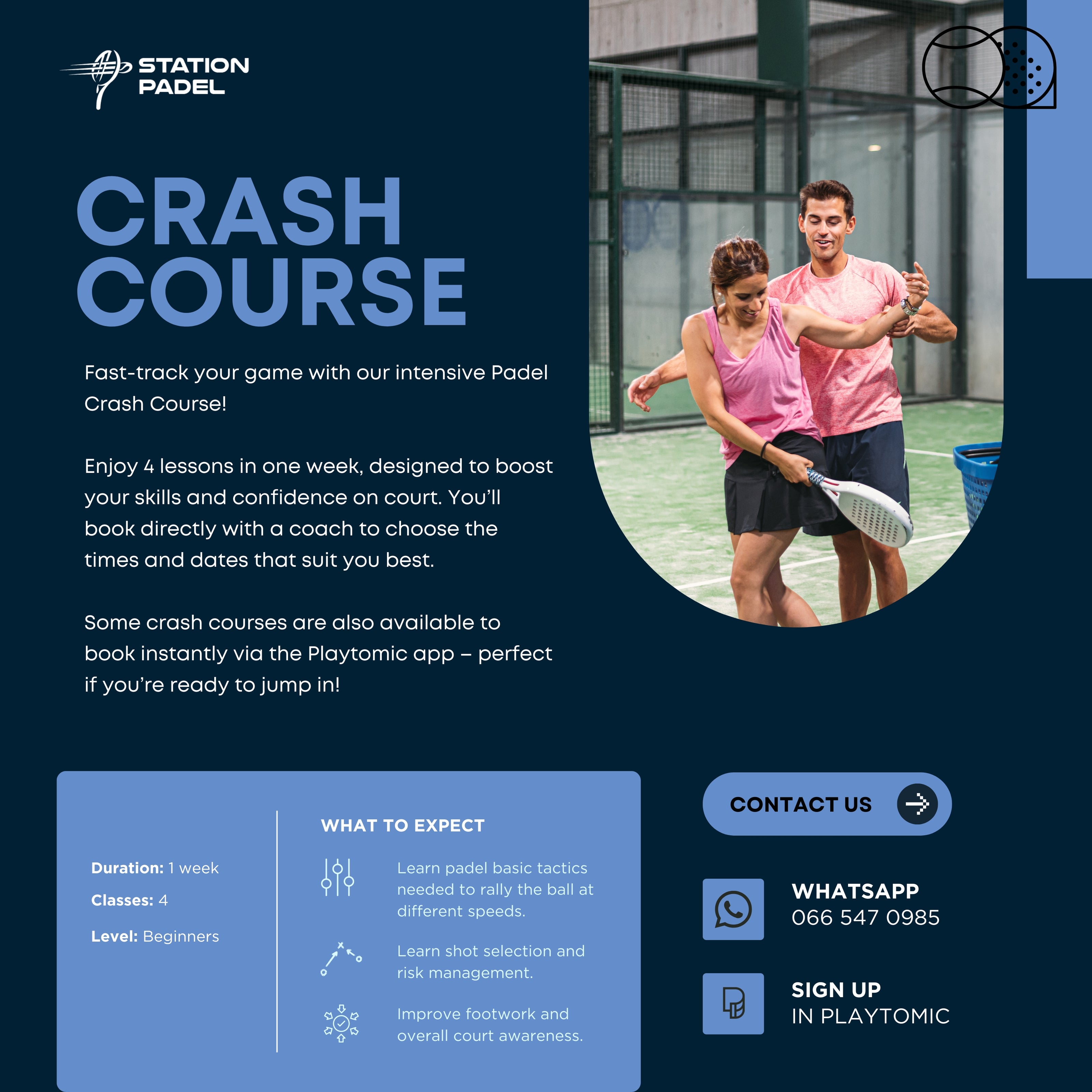 WHATSAPP THE CLUBHOUSEGet 4 lessons in a week, meant to enhance your skills and confidence on court.