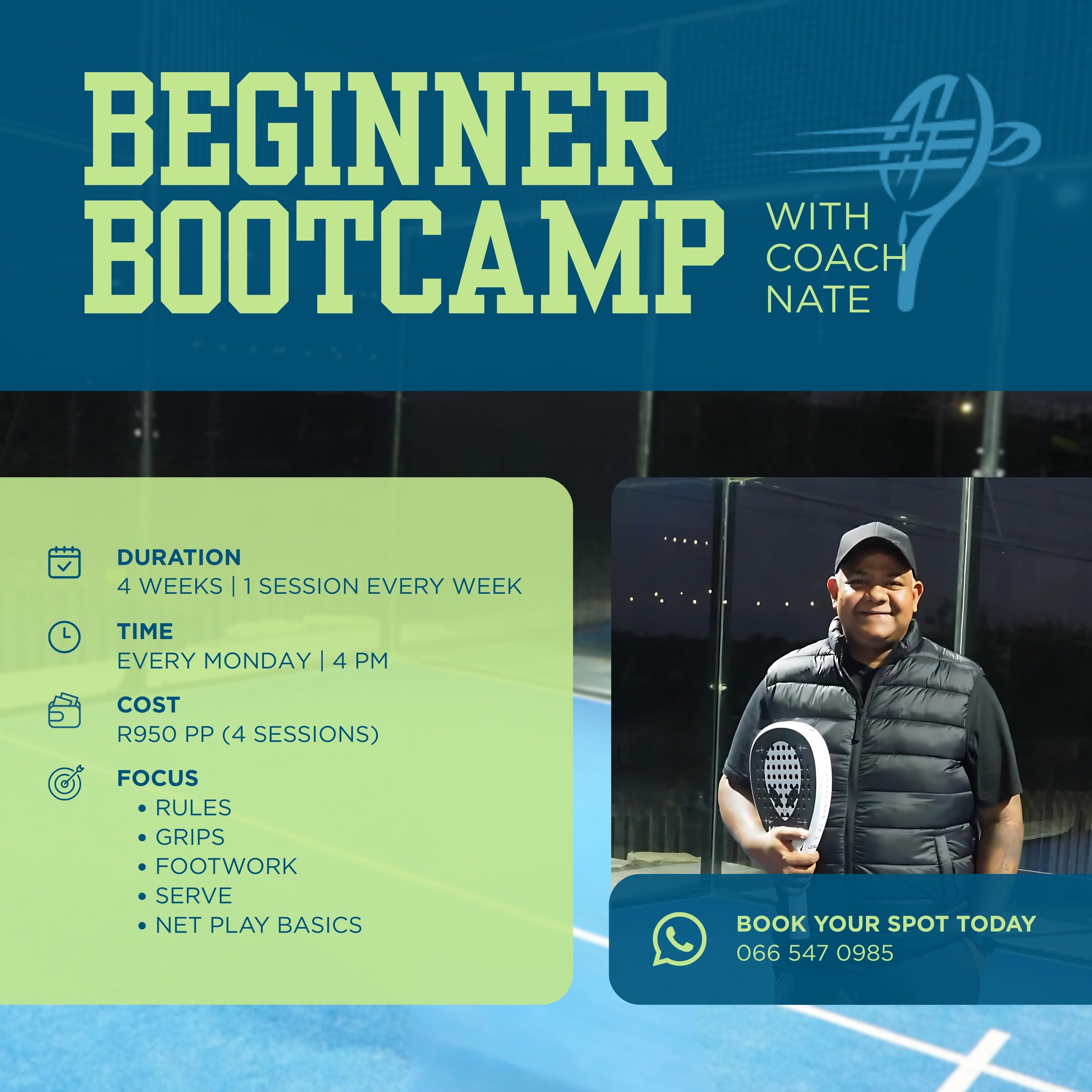 WHATSAPP THE CLUBHOUSEIntroductory bootcamp program for novice padel enthusiasts. Enroll in the program led by instructor Nate.