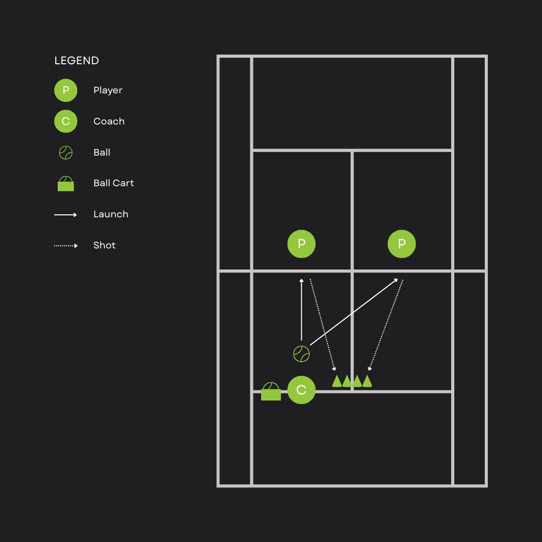 Description: Two players are positioned at the net, and they hit 4 bandejas, intending to hit the cones placed in the centre of the court.